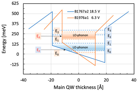 As the main results, we would like to draw the attention of the readers again to Figure 4, where the emission spectra for three different bias voltages are shown. In all of them, an obvious asymmetry towards higher energies can be seen. This asymmetry is the result of the interference of two differently broad Lorentz-shaped emissions [2,6]. Based on the particular spectral width—measured on either side of the medium line—their asymmetry factor ‘q’ can be determined. It tells us clearly that the observed emission is indeed highly asymmetric—pointing towards the fact that there is a non-negligible degree of interaction between the two types of emission here [15]. In reference [12], for instance, the authors write that their results have significant implications for electromagnetic metamaterials and photonic devices, with potential applications in exotic dispersion modulation and synthesis of light. In Figure 7 below, we compare the band structure of the main QW of the two samples of this study at LO-phonon resonance. It is obvious that the resonance condition was in one case (B1767a2) fulfilled between states E0 and E1, while in the other case (B1976a1), it occurred between states E1 and E2. The reason for this marked difference is the much higher doping of the second sample.