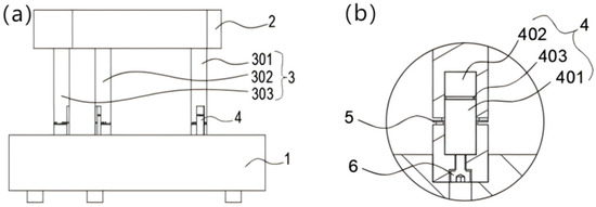 Overall structure (a) and partial diagram (b). 1—base, 2—working platform, 3—drivable legs, 4—piezoelectric ceramic module, 5—flexible hinge, 6—prefixing screws, 301—first drivable leg, 302—second drivable leg, 303—third drivable leg, 401—piezoelectric ceramic driver, 402—piezoelectric ceramic sensor, 403—epoxy resin.