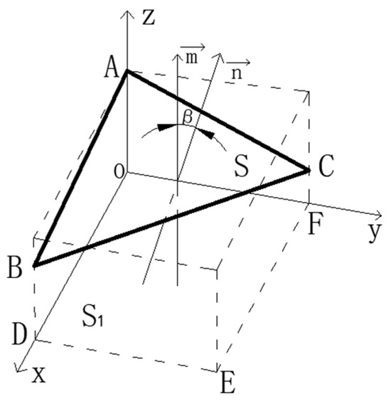 In the coordinate system A(0,0,z1), B(x,0,z2), C(0,y,z3), D(x,0,0), E(x,y,0), F(0,y,0), let the platform ABC force A point leg force be the smallest, the C point leg force be the largest, then the deformation between the legs for z1-z3 = ΔL3-ΔL1, z1-z2 = ΔL2-ΔL1, and then with the above Formula (5) substitution, the normal vector of the work platform ABC = , the horizontal reference surface S1 normal vector = (0,0,1), find the cosβ of the angle between the surface S and S1; at this time β is the angle of inclination, that is