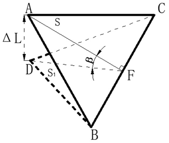 The tilt angle between the working platform ABC and the pressurized inclined plane DCB is still β (the two planes are represented by S and S1, respectively), and ΔL is the pressurized deformation variable of the two planes in the axial direction. And AF ⊥ BC, because the side length of the working platform is 2a, so AF = a.