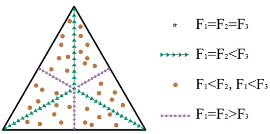 After finding F1, F2, and F3 according to Equation (3), the force situation of each drivable leg can be divided into four cases, such as F1 = F2 = F3, F1 < F2 and F1 < F3, F1 = F2 < F3 and F1 = F2 > F3. In practice, to ensure that the working platform is not unbalanced by the overturning moment, the force point area of the leveling mechanism is distributed in an equilateral triangle.
