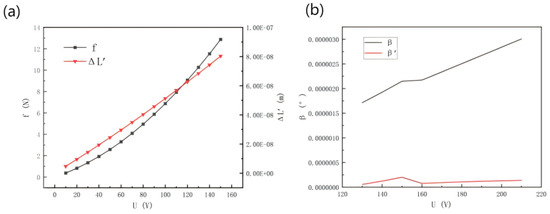 Figure 11a shows the theoretical deformation of the piezoelectric ceramic and the driving force relationship curve obtained when substituting the above Equations (2) and (6) when the driving voltage is in the range of 10~150 v. From the driving force curve, it can be seen that the driving force f generated by applying the driving voltage to the piezoelectric ceramic driver is in the range of 0–13 N, which is within the same magnitude as the partial force F applied to the working platform leg; from the piezoelectric ceramic deformation curve, it can be seen that the displacement generated by applying the voltage is in the range of +10−7~10−8 m. Compared with the simulation results of the above-mentioned force deformation, it can be verified that the deformation of the leg under force and the piezoelectric ceramic micro-displacement are in the same range. The unification of the micro-displacement produced by the ceramic.