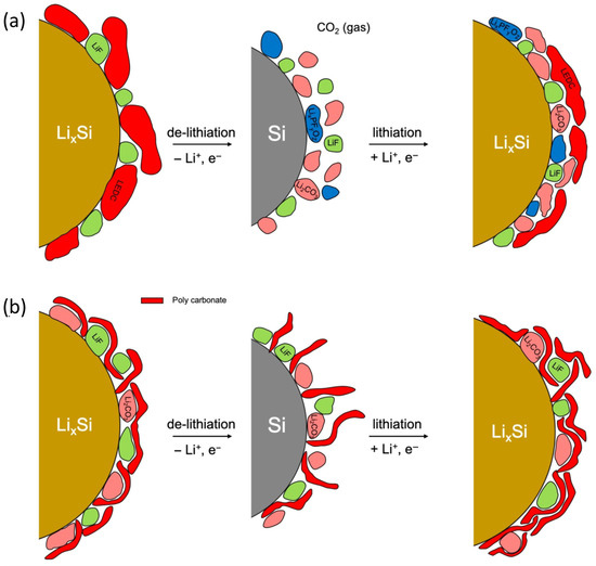 - Xu, C.; Lindgren, F.; Philippe, B.; Gorgoi, M.; Björefors, F.; Edström, K.; Gustafsson, T. Improved performance of the silicon anode for Li-ion batteries: Understanding the surface modification mechanism of fluoroethylene carbonate as an effective electrolyte additive. Chem. Mater. 2015, 27, 2591–2599. [Google Scholar] [CrossRef]