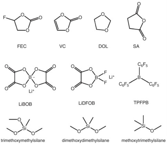 - Zhang, S.; He, M.; Su, C.-C.; Zhang, Z. Advanced electrolyte/additive for lithium-ion batteries with silicon anode. Curr. Opin. Chem. Eng. 2016, 13, 24–35. [Google Scholar] [CrossRef]