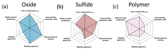| Sulfide (Li6PS5Cl) | ~10−3~10−2 | Moderate (ductile, sensitive) | Good (enhanced with coatings) | High | [80] |