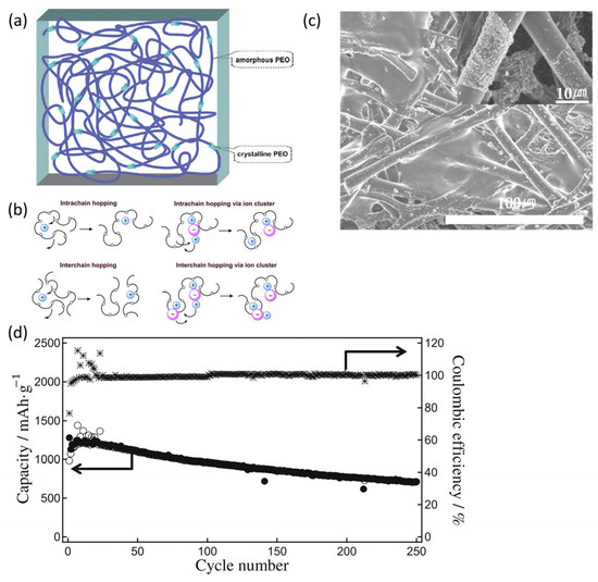 - Zhang, J.; Huang, X.; Wei, H.; Fu, J.; Huang, Y.; Tang, X. Novel PEO-based solid composite polymer electrolytes with inorganic–organic hybrid polyphosphazene microspheres as fillers. J. Appl. Electrochem. 2010, 40, 1475–1481. [Google Scholar] [CrossRef]