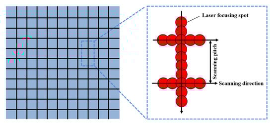 The testing material was bulk Si3N4 ceramic (Shenzhen Hard Precision Ceramic Co., Ltd., Shenzhen, China). The schematic diagram illustrating the laser surface texturing of the Si3N4 ceramic is presented in Figure 1. Prior to the laser treatment, the surface of materials was mirror-polished. The texturing procedure was performed using a picosecond laser (RA-RIR-60, Jiangsu Raytolaser Technology Co., Ltd., Suqian, China) with a pulse width of 10 ps and a wavelength of 1064 nm. The diameter of focused spot on the surface of Si3N4 ceramic was approximately 20 μm. The laser power was operated at a power of 9 W, with a repetition frequency of 60 kHz and a scanning pitch of 300 μm. Various scanning speeds (60 mm/s, 120 mm/s, 180 mm/s, 240 mm/s, 300 mm/s) and the number of scans (5, 15, 25, 35, 45) were used as processing variables. Before and after the laser surface texturing and subsequent characterization, Si3N4 ceramic was ultrasonically cleaned in ethanol for 20 min to remove contaminants and debris.