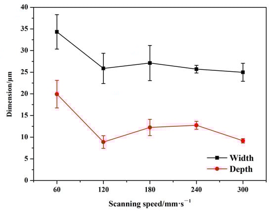- As the scanning speed increased, the bottoms of the grooves became more apparent. The edges of the grooves appeared more uniform. This was closely linked to how the laser energy was distributed spatially. When the scanning speed increased from 60 mm/s to 120 mm/s, there was a notable reduction in both the width and depth of the grooves. With further increases in the scanning speed, the width and depth of the grooves presented only slight fluctuations around 25 μm and 10 μm, respectively.