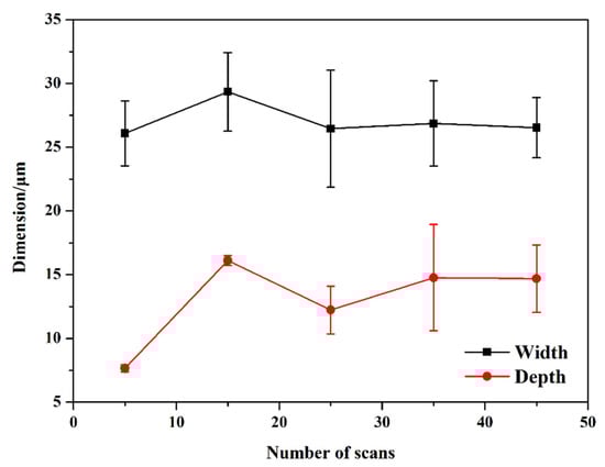 Figure 5 shows the dimensions of textured patterns on the surface of Si3N4 ceramic with a varying number of scans. The depth of the grooves presented more significant changes with the number of scans compared to the width. The main reason might be that the energy from the laser beam was primarily focused on the depth direction of the grooves. As a result, multiple scans had a greater impact on the depth, leading to more pronounced changes. This phenomenon was also observed in the groove processing of Ni alloy [37] and glass substrate [38]. The effects of increasing the number of scans and the scanning speed on the textured patterns differed. As the number of scans increased from 5 to 25, both the width and depth of the groove increased initially, and then decreased slightly. This behavior contrasted with the slight increase in groove dimension observed with higher scanning speed. The increase in scanning times led to more accumulation of slags at the bottom of the grooves. These residues were difficult to remove. Consequently, the dimensions of the grooves did not increase continuously with more scans but instead began to decrease. In other words, processing the grooves became more challenging at greater depths. As the number of scans continued to rise, the dimensions of the textured patterns stabilized, indicating that the laser surface texturing had reached a balanced state.