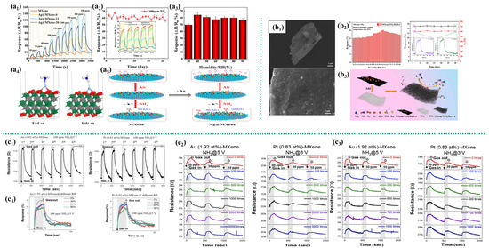 (a) Ag@MXene [61]: (a1) schematic diagram of multiple response recovery curves, (a2) 20-day response line chart, (a3) response graphs at different humidity levels, (a4) DFT calculated adsorption diagram, and (a5) Ag sensitization mechanism; (b) MXene/TiO2/Ru [63]: (b1) SEM, (b2) the response graphs of the sensor under different humidity conditions and the 30-day response graph, and (b3) schematic diagram of the sensor and the gas-sensitive performance; (c) Au/MXene or Pt/MXene [42]: (c1) long-term cycle diagram, (c2) response graphs of different bending cycles, (c3) response graphs of different bending cycles, and (c4) the response graphs of the sensor under different humidity conditions.