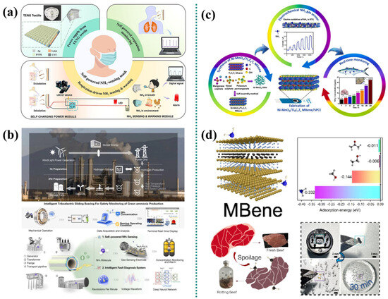 (a) The self-driven data transmission unit of the high-performance Ga2O3/MXene ammonia sensor automatically regulates and stores the output schematic diagram of the independent rotating bucket TENG [76]; (b) schematic diagram of the sensing and early warning principle of the external environment NH3 for the smart mask based on the Ti3C2Tx/PANI sensor [77]; (c) schematic diagram of real-time monitoring of the freshness of packaged food using Ni-MnO2/Ti3C2Tx ammonia gas sensor [78]; and (d) schematic diagram of the gas released during the spoilage process of beef detected by MBene gas sensor [79].
