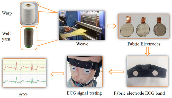 In recent years, mobile medical devices based on textile-structured, flexible ECG electrodes have emerged as potential solutions. Wearable fabric electrodes serve as flexible medical sensors developed using textile technology that enable the sensing of biological electrical signals on the human body’s surface [3,4,5]. Fabric electrodes primarily consist of conductive materials intertwined with traditional textiles or conductive materials adhered to yarns or fabrics through various coating processes to form diverse fabric electrode structures [6,7,8,9].