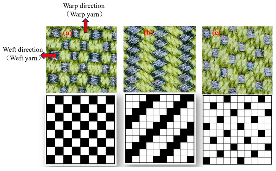Figure 2. The fabric’s weave, diagram, and Physical photograph: (a) Plain weave; (b) 2/3 right twill; (c) 3/5 weft satin.
