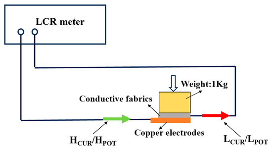Since the conductive yarns inside the fabric-type electrodes mostly present a three-dimensional buckling state, applying different pressures to the electrodes will cause different degrees of changes in the internal structure of the electrodes, thereby resulting in different electrical properties of the electrodes. Therefore, when conducting surface resistance tests on the electrodes, it is necessary to ensure that the pressure conditions are consistent for all samples being tested. Connect one end of the multimeter to the left side of the copper plate, and the other end to the electrode transmission line (the resistance of the transmission line can be ignored). Place the fabric electrode against a clean copper plate, then place an insulated weight of 1 kg on the back of the embroidered fabric electrode to completely cover the electrode and make it adhere tightly to the copper plate, as shown in Figure 3. Note that the tested electrode should be placed at the center of the insulated weight to ensure uniform force on the electrode and reduce experimental errors. Set the test frequency to 0.1–1000.0 Hz and the test voltage to 5 mV.
