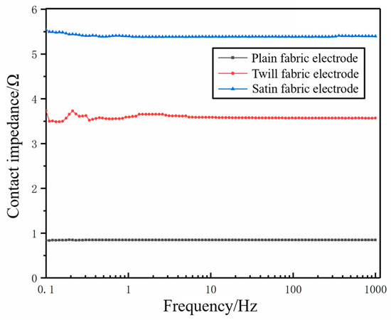 The contact impedance between electrodes of the same organizational structure and the skin decreased with increasing wearing pressure. Satin and twill structure electrodes had lower contact resistance with the skin than plain fabric electrodes, and their impedance curves changed more smoothly.