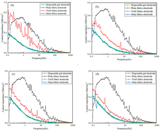 Figure 5. The impedance diagram of the contact between the electrode and the skin of different tissue structures under the same wearing pressure: (a) 2 kPa; (b) 3 kPa; (c) 4 kPa; (d) 5 kPa.