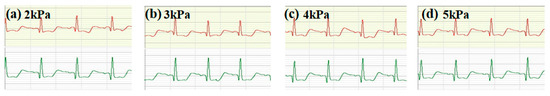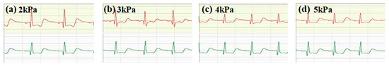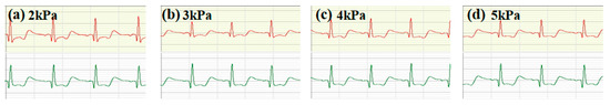 Dynamic electrocardiograms obtained using electrodes of varying tissue structures, under uniform wearing pressures (2 kPa, 3 kPa, 4 kPa, and 5 kPa), are depicted in Figure 12, Figure 13, Figure 14 and Figure 15.