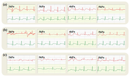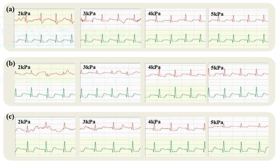 Subsequent Figure 7c and Figure 9b indicate that movements such as chest expansion and right arm elevation are more susceptible to changes in wearing pressure. At pressures of 2 kPa to 3 kPa, there is a notable degradation in signal quality with the plain fabric electrode, rendering identification of the P, T, and QRS components challenging, which underscores the critical role of wearing pressure in securing reliable ECG readings. Conversely, at increased pressures ranging from 4 kPa to 5 kPa, signal recognition deteriorates even further, with the QRS complex, P waves, and T waves becoming less distinctive.