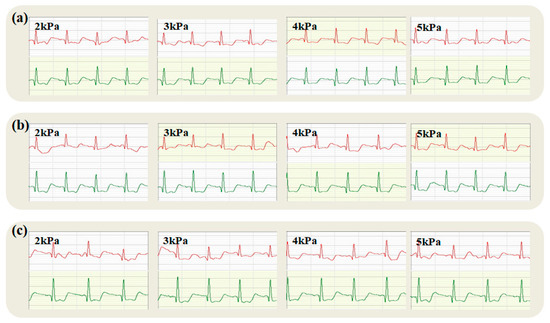 The expansion of the chest and the raising of the right arm belonged to the limb movements. The test results are shown in Figure 9b,c, Figure 10b,c, and Figure 11b,c, respectively. These two movements had a significant effect on the quality of the ECG collected under the wearing pressure of 2 kPa and 3 kPa. When the right arm was moved upward, the P-wave, T-wave, and QRS waves were not recognized in the ECGs acquired with the plain structure electrodes at 2 kPa and 3 kPa. On the other hand, at wearing pressures of 4 kPa and 5 kPa, ECGs acquired with electrodes of different tissue structures for three motions were basically able to clearly distinguish QRS waves, except for P- and T-waves, which could be recognized by the plain electrodes. Therefore, it can be concluded that the quality of ECG signals acquired at larger wear pressure was superior to that of ECG signals acquired at smaller pressure. According to the pressure range of the human body comfort clothing (1.96–3.92 kPa), the optimal pressure range is 3–4 kPa.