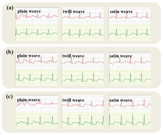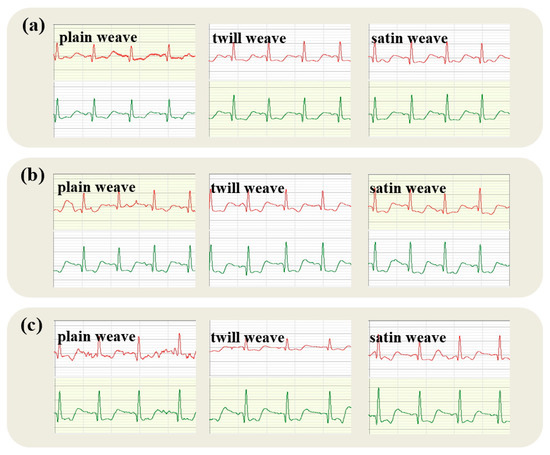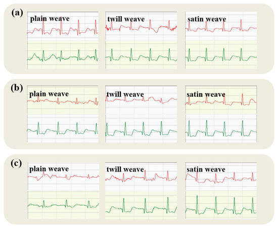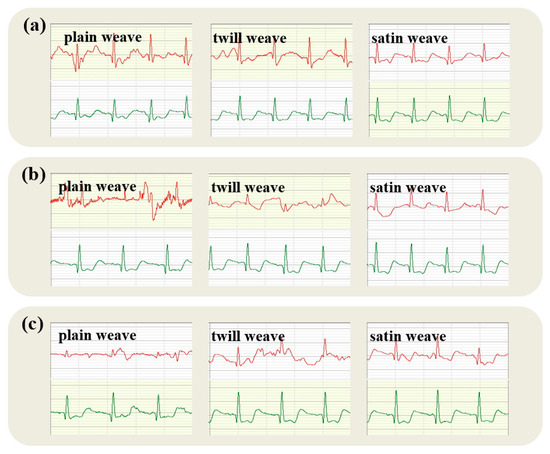 Figure 11. The dynamic ECG collected by the satin tissue structure fabric electrodes under different wearing pressures: (ac) were sitting and standing, chest expansion, and right arm upward movements, respectively (ECG traces from the textile electrode are shown in red; traces from the commercial soft gel electrode are shown in green).