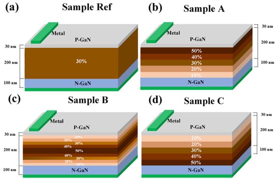 - Tsai, Y.L.; Wang, S.W.; Huang, J.K.; Hsu, L.H.; Chiu, C.H.; Lee, P.T.; Yu, P.C.; Lin, C.C.; Kuo, H.C. Enhanced power conversion efficiency in InGaN-based solar cells via graded composition multiple quantum wells. Opt. Express 2015, 23, A1434–A1441. [Google Scholar] [CrossRef] [PubMed]