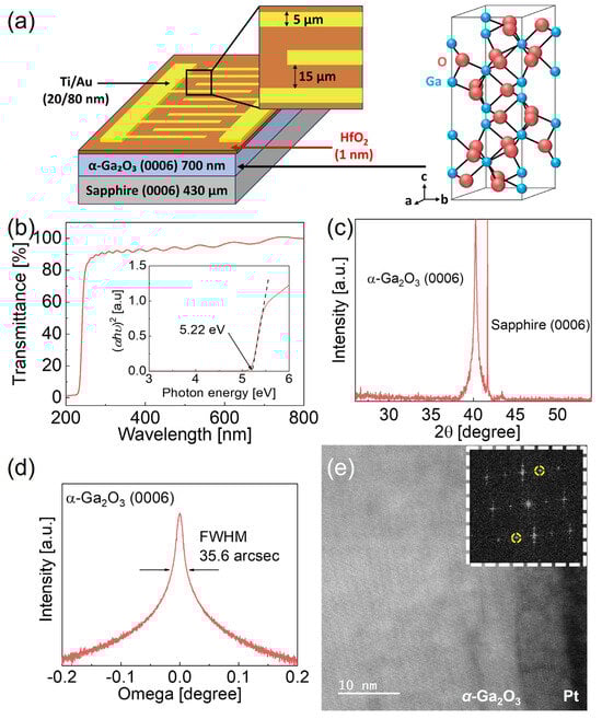 (a) Schematic of the MISIM photodetector, featuring an HfO2 insulating layer on α-Ga2O3 and a 3D schematic diagram of the α-Ga2O3 lattice structure. (b) Optical transmittance spectrum with an inset showing the optical bandgap of the heteroepitaxial α-Ga2O3 layer, estimated using a Tauc plot. (c) High-resolution X-ray diffraction (HR-XRD) 2θ scan of the heteroepitaxial α-Ga2O3 layer. (d) HR-XRD rocking curve for the (0006) diffraction peak. (e) Cross-view transmission electron microscope (TEM) image of α-Ga2O3 thin film with an inset selected area electron diffraction pattern.