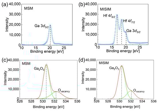 Figure 2 investigates the deposition of HfO2 via X-ray photoelectron spectroscopy (XPS) and assesses the impact of ozone supplied during atomic layer deposition (ALD) on oxygen vacancies. Figure 2a presents the Ga 3d spectrum for the MSM structure, showing a peak at a binding energy of 20.1 eV. In contrast, Figure 2b reveals additional Hf 4f peaks at 16.9 eV and 18.5 eV in the MISIM structure, confirming successful HfO2 deposition [,]. Figure 2c,d display the O 1s spectra, deconvoluted into two peaks at 530.6 eV (Ga-O bonds) and 532.1 eV (oxygen vacancies). The oxygen vacancy ratio, calculated from the peak areas, was 28.8% for the MSM structure and 23.1% for the MISIM structure, indicating a 5.7% reduction attributed to the oxygen vacancy treatment effect from the ozone during ALD. Oxygen vacancies are known to impair photodetector performance by increasing the dark current []. While oxygen annealing typically requires temperatures above 600 °C for a significant effect, the ALD process at 360 °C yielded only modest vacancy reduction [,].