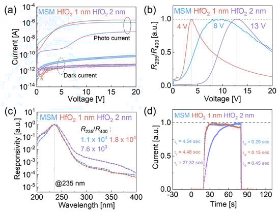 where Ip is the channel current under illumination, Id is the dark current, P is the incident light intensity, and Sdevice is the effective irradiated area. The rejection ratios (R235/R400) were 1.1 × 104 (MSM), 1.8 × 104 (1 nm HfO2 MISIM), and 7.6 × 103 (2 nm HfO2 MISIM), with the 1 nm HfO2 MISIM device showing high responsivity at 235 nm and low responsivity at 400 nm, confirming enhanced UVC selectivity. Figure 3d shows the response current during UVC switching on/off at 235 nm under a bias of 20 V. The rise time (τr) and decay time (τd), defined as the time required for the current to change from 10% to 90% and from 90% to 10% of its final value, respectively, were measured for the MSM, as well as the 1 and 2 nm HfO2 MISIM devices as 4.51 s, 4.48 s, and 27.32 s for τr and 0.29 s, 0.15 s, and 0.45 s for τd, respectively. The 1 nm HfO2 MISIM device’s faster τr and τd resulted from the reduced trapping of photogenerated holes at the surface states. Conversely, the 2 nm HfO2 MISIM device’s thicker layer lowered the tunneling probability, slowing carrier transport and extending response times [].