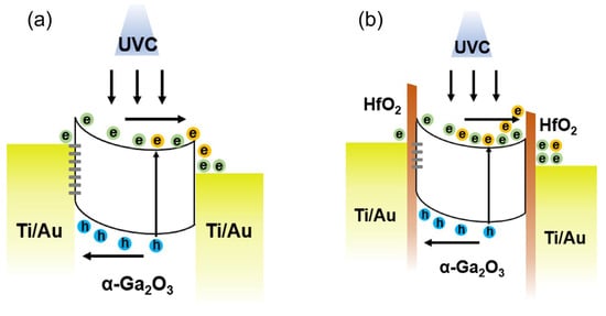 Energy band diagrams of heteroepitaxial α-Ga2O3 layer-based UVC photodetectors: (a) MSM structure and (b) MISIM structure.