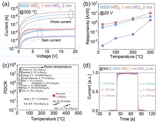 Figure 5a presents the I–V measurements at 300 °C. Below 8 V, the 1 nm HfO2 MISIM device exhibited a higher current than the MSM device, which is attributed to reduced interface traps and moderated tunneling suppression. Figure 5b compares the responsivity at 20 V as a function of temperature, showing an increase with temperature. This behavior can be attributed to thermal excitation, which affects both Ip and Id. However, while the increased Id is primarily attributed to thermally generated carriers, the increased Ip is ascribed not only to the thermally generated carriers but also to enhanced photoexcitation at elevated temperatures, which further facilitates the de-trapping of carriers from trap states. Consequently, more carriers become available for conduction under illumination, leading to an increased photocurrent and enhanced responsivity at an elevated temperature []. Figure 5c illustrates PDCR with variable temperatures for UV photodetectors based on Ga2O3 and various other materials [,,,,,,,,,,,]. Most previously reported works have included characterizations at room temperature, and characterizations at elevated temperatures are not investigated enough. Our work demonstrates insertion of the ultra-thin HfO2 interlayer-enabled high PDCR even under high-temperature conditions. Figure 5d shows the transient response at 300 °C. The τr and τd for the MSM and 1 and 2 nm MISIM devices were 0.47 s, 1.21 s, and 1.39 s and 1.16 s, 1.05 s, and 1.67 s, respectively. At 300 °C, the increased thermal energy enabled electrons in the MSM device to escape interface traps and enter the conduction band more readily, resulting in a shorter τr compared with the 1 nm HfO2 MISIM device. However, the decay times were longer than those at room temperature because of the increased persistent photoconductivity (PPC) effect. PPC refers to the phenomenon in which photoconductivity persists even after the light source has been removed. This effect is commonly observed in oxide semiconductors with oxygen vacancies and a high density of defects [,,].