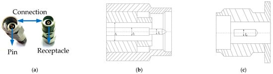 Mechanical structure of the Precision 2.92 mm RF Connector: (a) external view; (b) dimensional specifications of the pin (l1 = 0.93 mm, l2 = 1.27 mm, l3 = 2.93 mm); and (c) dimensional specifications of the receptacle (l4 = 1.27 mm).