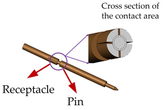 In addition to dimensional matching, the connectors require carefully engineered interconnect strategies. The outer conductors are joined via a robust, threaded coupling mechanism, which ensures mechanical and electrical stability. In contrast, the central conductors rely on a non-fixed, spring-loaded pin-and-receptacle configuration. This configuration forms an electrical path through elastic contact, which is inherently less stable and highly sensitive to both mechanical and surface conditions. In particular, the contact region at the center conductor is subject to micro-scale asperity contact, where local resistance and current distribution are strongly influenced by the surface roughness and plating quality of the contact interface. Figure 2 depicts the contact structure between the pin and receptacle of the central conductor in the precision 2.92 mm RF connector, emphasizing the non-fixed, elastic interface at the central conductor contact.
