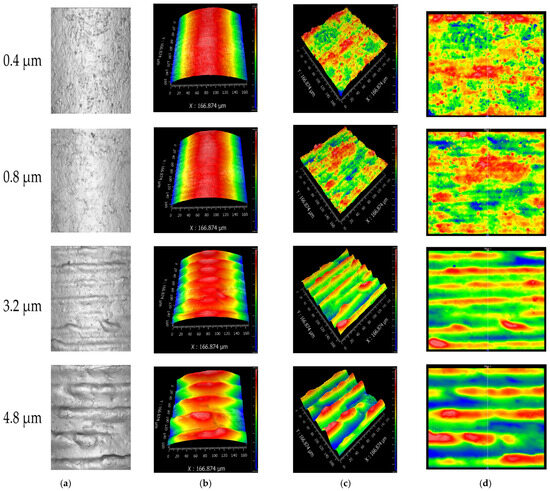 The surface topography of each contact interface was subsequently measured using a ZYGO three-dimensional white light interferometric surface profilometer, as shown in Figure 3b. The measurement and processing procedures for the surface morphology are illustrated in Figure 4a. For each sample, a region of 166.874 μm × 166.874 μm—the maximum area measurable in a single scan by the instrument—was selected on the central contact area of the pin for topographical analysis. To ensure statistical reliability and spatial consistency, three equally spaced regions were measured on each contact surface to extract surface parameters. Figure 4a shows the measured surface topographies of the pin from connectors with different maximum surface heights (Sz). As the maximum height of the contact surface increases—precisely adjusted via machining parameters—the simulated insertion wear marks become more prominent, with the depth of scratches exhibiting systematic and repeatable variation. This results in a visibly rougher surface morphology that reflects different levels of mechanical degradation. Figure 4b presents the intermediate data processing step, where the raw topography is modeled to facilitate mathematical treatment and eliminate the influence of the pin’s curvature radius. Figure 4c displays the resulting microstructure of the contact surface after curvature compensation, revealing the true contact interface. Figure 4d provides a frontal view of the processed contact surface morphology, suitable for micro-contact analysis. Based on the above measurement results, the scratches in this study were found to be relatively uniformly distributed, with minimal variation in the peak heights of individual asperities and similarly small differences in valley depths across the contact surface. Therefore, the maximum surface height (Sz) was selected as a representative roughness parameter to characterize the scratch-induced condition of the contact interface.