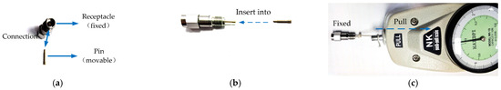 Measurement procedure for maximum static friction force: (a) fixed receptacle of the connector and movable pin; (b) the interconnection between the fixed receptacle and the movable pin; and (c) friction force measurement during pin extraction.