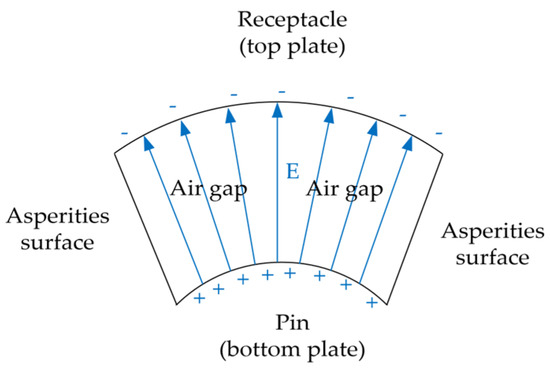 According to Equation (4), the number of asperities within the apparent contact area can be estimated by multiplying the asperity density D with the apparent contact area A. Elevated asperities—typically originating from surface scratches—tend to form localized separations from the opposing contact surface, thereby generating air gaps. Assuming a relatively uniform distribution of scratch-induced asperities, a one-to-one correspondence between elevated asperities and capacitive gaps is considered. Accordingly, the number of capacitive gaps N is taken to be approximately equal to the number of asperities that are sufficiently elevated to prevent direct mechanical contact with the mating surface.