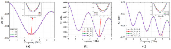 The S21 parameters of the connectors with different roughness obtained by an equivalent circuit model: (a) one connector; (b) two connectors with the same roughness cascade; and (c) three connectors with the same roughness cascade.