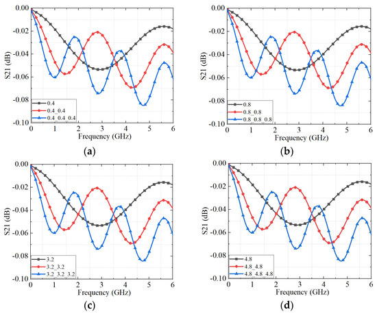 The S21 parameters of the connectors with different connectors cascade obtained by an equivalent circuit model. (a) The roughness of each connector is 0.4 μm; (b) the roughness of each connector is 0.8 μm; (c) the roughness of each connector is 3.2 μm; and (d) the roughness of each connector is 4.8 μm.