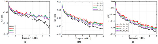 The measured S21 parameter of the connectors with different roughness. (a) one connector; (b) two connectors with the same roughness cascade; and (c) three connectors with the same roughness cascade.