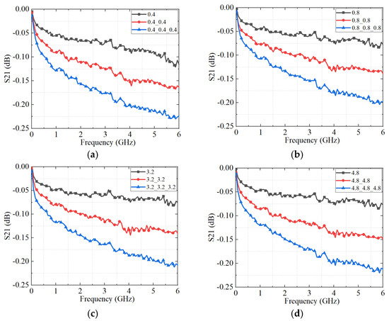 The S21 parameters of the connectors with different connector cascades obtained by a VNA. (a) The roughness of each connector is 0.4 μm; (b) the roughness of each connector is 0.8 μm; (c) the roughness of each connector is 3.2 μm; and (d) the roughness of each connector is 4.8 μm.