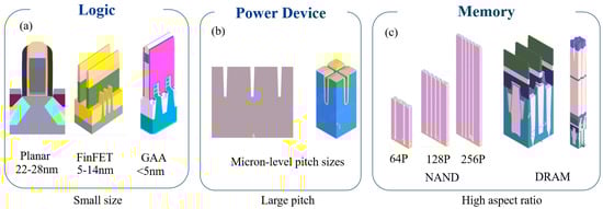 Schematic representation of advanced semiconductor devices: (a), logic devices, e.g., Gate-All-Around (GAA) with sub-5 nm features; (b), power/RF devices, e.g., IGBT with large-pitch gratings; (c), memory devices, e.g., 3D NAND with high-aspect-ratio memory holes.