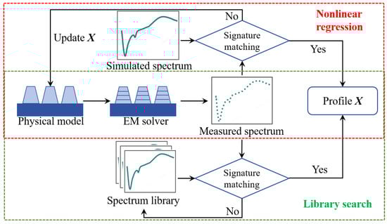 Workflow for solving inverse problems in optical metrology: red box (nonlinear regression using iterative optimization); green box (library search with pre-computed spectra); arrows indicate parameter adjustment and matching steps [].