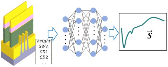 Constructing a inverse predict model that maps spectra directly to CDs offers an intuitive approach for parameter retrieval(shown in Figure 6) [,,,,,,,,,,,,]. Pioneering research in 1998 demonstrated the use of diffraction order intensities as neural network inputs to predict grating CDs []. Limited by early computational power, initial models employed constrained input feature dimensions. For instance, Wei et al. utilized only six sets of multi-wavelength scattering efficiencies as input []. By 2023, however, significant advancements were evident, with Fu et al. successfully incorporating the full-spectrum data of all 16 Mueller matrix elements into the input dimensionality, enabling more comprehensive feature extraction [].