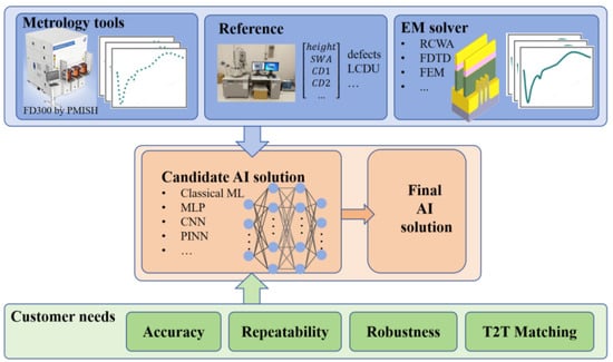 Meanwhile, AI technologies, particularly deep learning (DL), have achieved disruptive breakthroughs over the past decade, with their applications deeply penetrating fields such as industrial inspection, predictive maintenance, and complex system modeling. Within semiconductor manufacturing, the successful application of AI has already been validated: Convolutional Neural Networks (CNNs) have achieved 99.9% accuracy in wafer defect pattern recognition [], significantly surpassing traditional algorithms; and Reinforcement Learning (RL) has been used for real-time parameter tuning in etching and deposition processes, markedly improving uniformity []. These practices compellingly demonstrate AI’s capability to handle high-dimensional data and uncover complex nonlinear relationships, offering a novel paradigm for addressing the aforementioned metrology challenges.