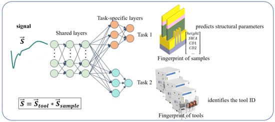 Key customer requirements addressed include metrology accuracy, precision, robustness, and T2T matching. In this context, accuracy denotes the deviation between measurements obtained by PMISH’s metrology tools and customer-provided reference (“golden”) values; precision refers to dynamic and static repeatability; and T2T matching signifies measurement consistency across different metrology tools. While T2T matching is a critical industry concern, it receives scant attention in academic studies. The few papers mentioning T2T matching are primarily promotional publications by relevant companies and typically lack substantive technical detail []. A method based on stochastic polynomial wavelength calibration (s-PWC) has been developed to address the T2T matching issue, but it appears to have overly one-sided considerations []. We therefore selected T2T matching as an exemplar to demonstrate the capabilities of PMISH’s next-generation J-profiler metrology technology. At a specific semiconductor manufacturing customer site utilizing multiple PMISH OCD metrology tools, most CDs exhibited strong measurement consistency across tools. However, for CDs exhibiting low sensitivity to optical signals within certain complex nanostructures, T2T consistency degraded. This inconsistency necessitated AI intervention. A measured optical signal inherently contains two coupled components, the sample’s optical response (sample signature) and the tool’s intrinsic response (tool intrinsic signature). Theoretically, decoupling the tool’s intrinsic signature from the measurement signal could achieve consistent results across all tools. We designed an algorithm framework based on Multi-Task Learning (MTL), as shown in Figure 9. The neural network input is the spectral response signal. The output has two branches: a regression network predicting the problematic, low-sensitivity parameters; and a classification network identifying the specific metrology tool that captured the input signal.