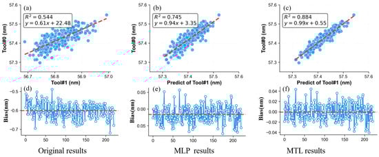 Performance of our MTL framework comparison for T2T matching. (a–c) represent the correlations of the original measurements, standard MLP regression network, and MTL network for Tool#0 and Tool#1, respectively; (d–f) show their respective biases. Our MTL framework reduces mean bias to near-zero and improves consistency.