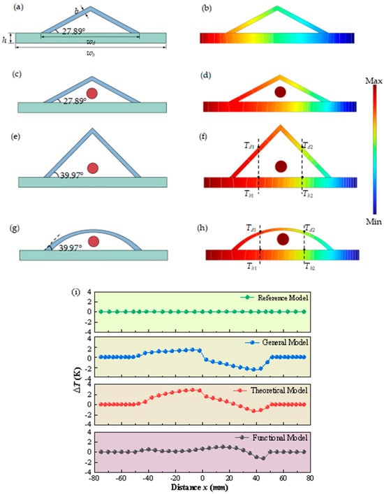This abrupt jump in observed within the posterior section is greatly suppressed by the modified theoretical model (named the functional model), which incorporates tangent arcs on both sides of the original theoretical model (the triangle structure). The functional model, depicted as an arc structure in Figure 4g, exhibits the temperature distribution shown in Figure 4h. As shown in Figure 4i, the temperature deviation of the functional model does not produce a sharp change at the coordinate x = 0 but remains closer to zero throughout the whole structure. This variation can be attributed to the influence of heat concentration on heat radiation transfer caused by the acute top angle of the triangular structure, which is eliminated by the smooth surface of the arc structure. The arc-shaped structure, through its smooth geometric shape, avoids the convergence of heat flow at the apex, allowing the heat flow to be more evenly distributed on the arc-shaped surface, thereby preventing the formation of high-temperature areas. The functional model demonstrates a maximum deviation value of 1.2 K, representing its smallest magnitude among all three models.