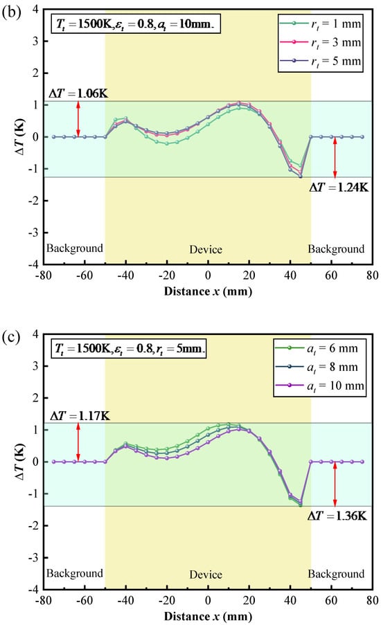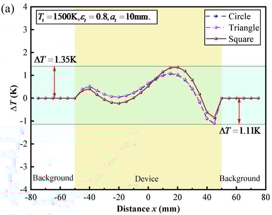 The effect of the geometry and the location of the target on the thermal camouflage performance of the thermal camouflage device was studied, as depicted in Figure 5a–c. Firstly, we systematically varied the shapes of the target, including a circle, triangle, and square, while maintaining a constant surface area. Subsequently, we maintained a circular shape for the target and adjusted its surface area by altering the radii values to 1 mm, 3 mm, and 5 mm. Finally, we employed a circular geometric target with a radius of 5 mm and varied the position of the target within the cavity between the camouflage and background by changing the y-coordinate of the target center by 6 mm, 8 mm, and 10 mm while keeping the x-coordinate constant. By combining Figure 5a–c, it can be found that regardless of the change in the shape, the surface area, or the position of the target, the temperature deviation always agrees closer to zero.