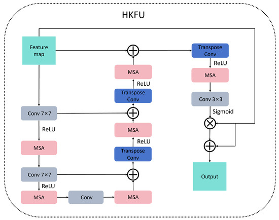 The Heterogeneous Kernel Fusion Unit (HKFU) is characterized by a symmetric encoder–decoder architecture that incorporates three levels of downsampling and upsampling paths. This design facilitates cross-level feature fusion through a dynamic gating mechanism. Furthermore, it innovatively integrates multi-scale convolutional kernels, spatiotemporal attention, and an adaptive gating system to achieve end-to-end feature refinement. Adhering to a ‘shrinking–refining–expanding’ design principle, the HKFU ensures the fusion of multi-scale information while maintaining the integrity of the feature space, as illustrated in