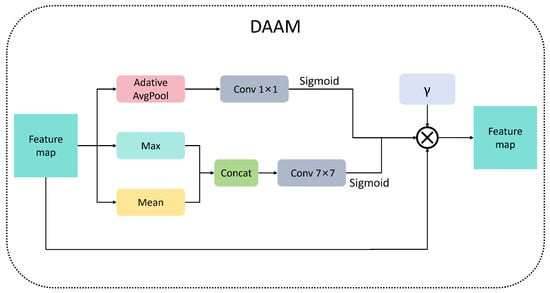 DAAM primarily consists of spatial and channel attention branches. The spatial branch extracts essential spatial information through channel-wise mean and maximum value maps. The mean map computes the arithmetic mean of all channels at each spatial position using global average pooling, resulting in a smooth regional energy representation. In contrast, the max map captures local salient feature points by identifying extreme values along the channel dimension. These two maps are concatenated and fed into a 7 × 7 large kernel convolutional layer for spatial context modeling, ultimately generating a spatial weight map through Sigmoid activation. The channel branch compresses the two-dimensional features of each channel into scalar descriptors via adaptive global average pooling, creating a channel-level global context representation. This representation then undergoes a non-linear transformation through a bottleneck structure consisting of two 1 × 1 convolutions, which first reduces the dimensionality with an 8:1 compression ratio and subsequently restores the original dimension. Finally, channel weight vectors are generated via Sigmoid activation.