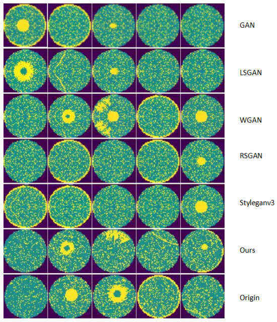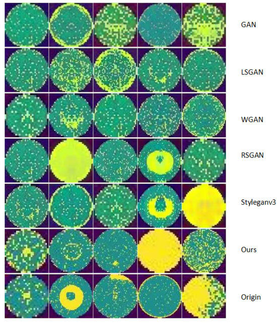 Specifically, our model’s outputs (sixth row) exhibit more consistent defect edges, finer texture details, and closer alignment with the real defect distribution (last row) compared to other models—for instance, clearer boundary definition than GAN/LSGAN, more stable defect morphology than WGAN/RSGAN, and better preservation of subtle defect features than StyleGANv3. This category-specific, feature-matched comparison highlights that our model not only achieves quantitative superiority in metrics but also generates qualitatively more realistic images with faithful defect characteristics.